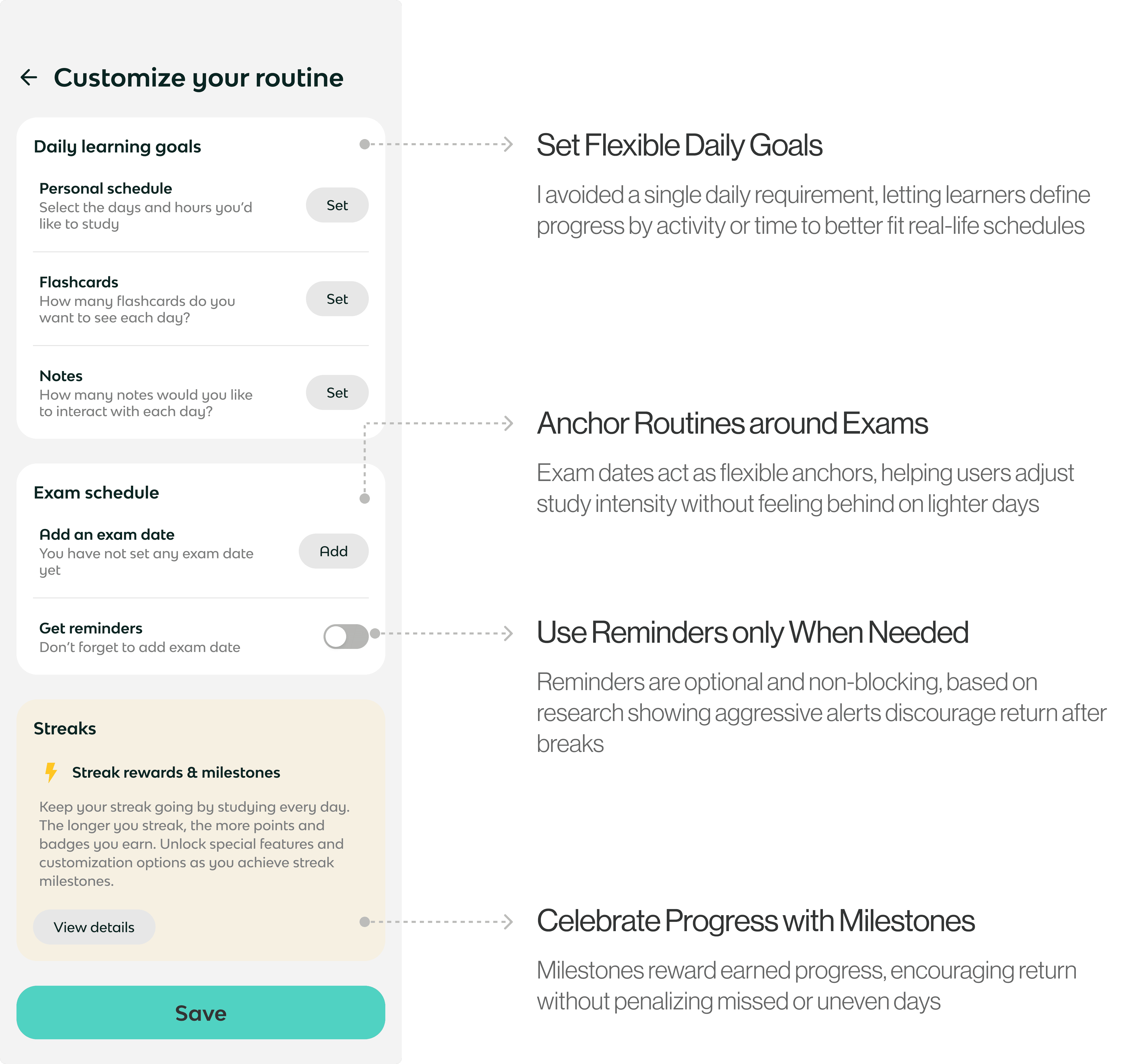 These patterns revealed three core needs (1. visible momentum, 2. flexible goals, 3. gentle encouragement), which directly influenced the design of the streak system. Together, they shifted the focus from enforcing daily streaks to supporting learners through breaks.