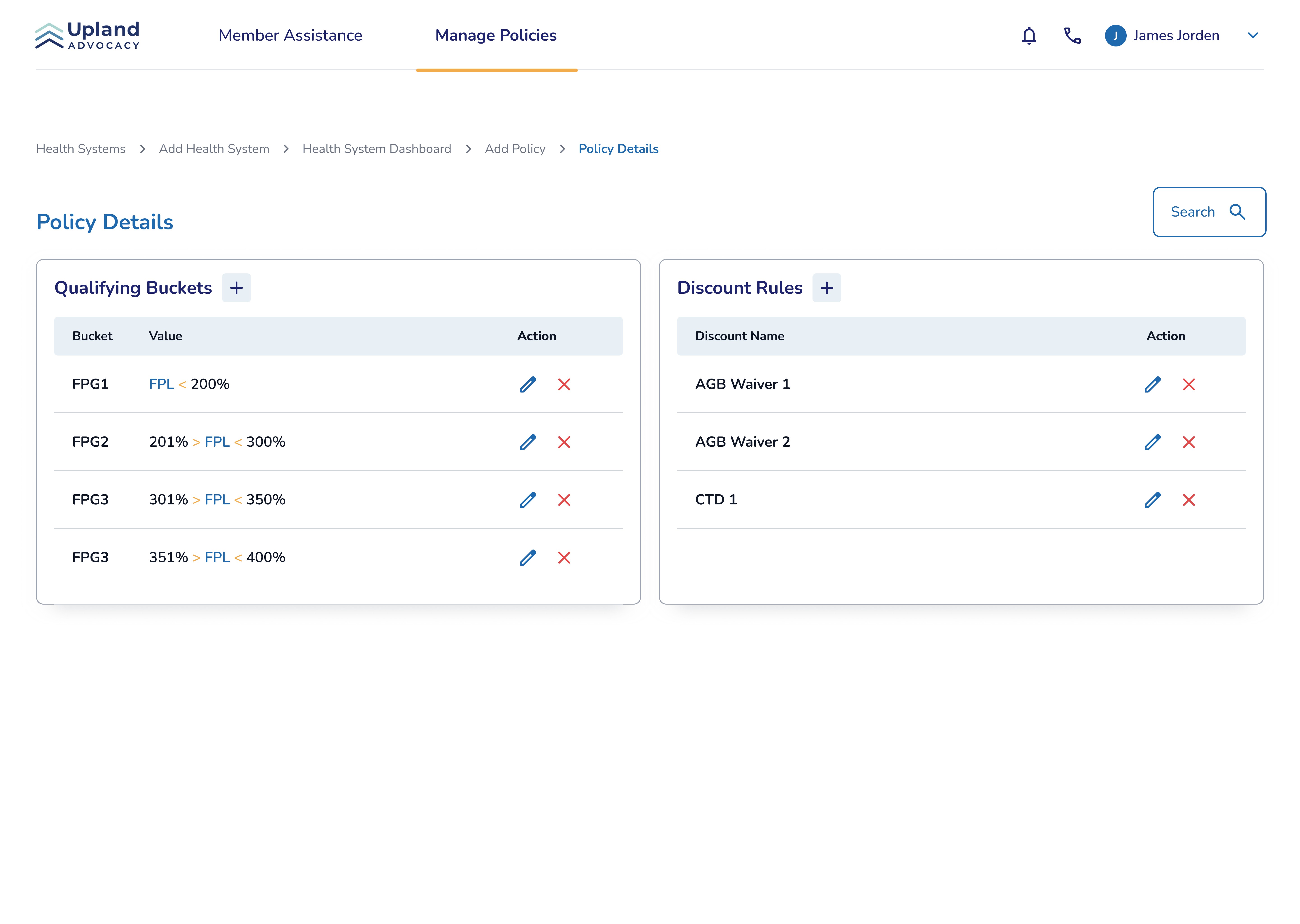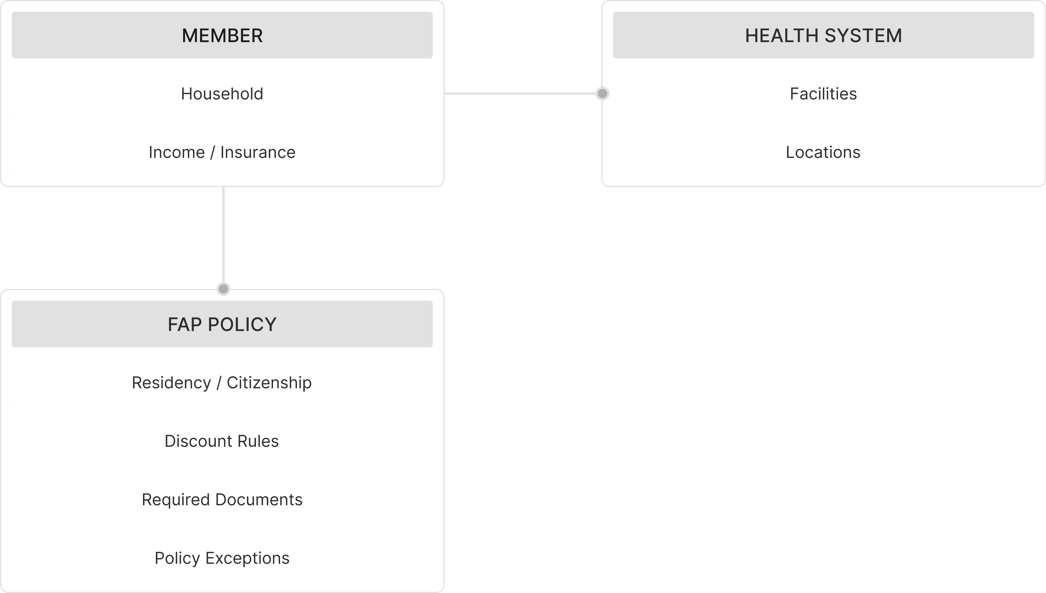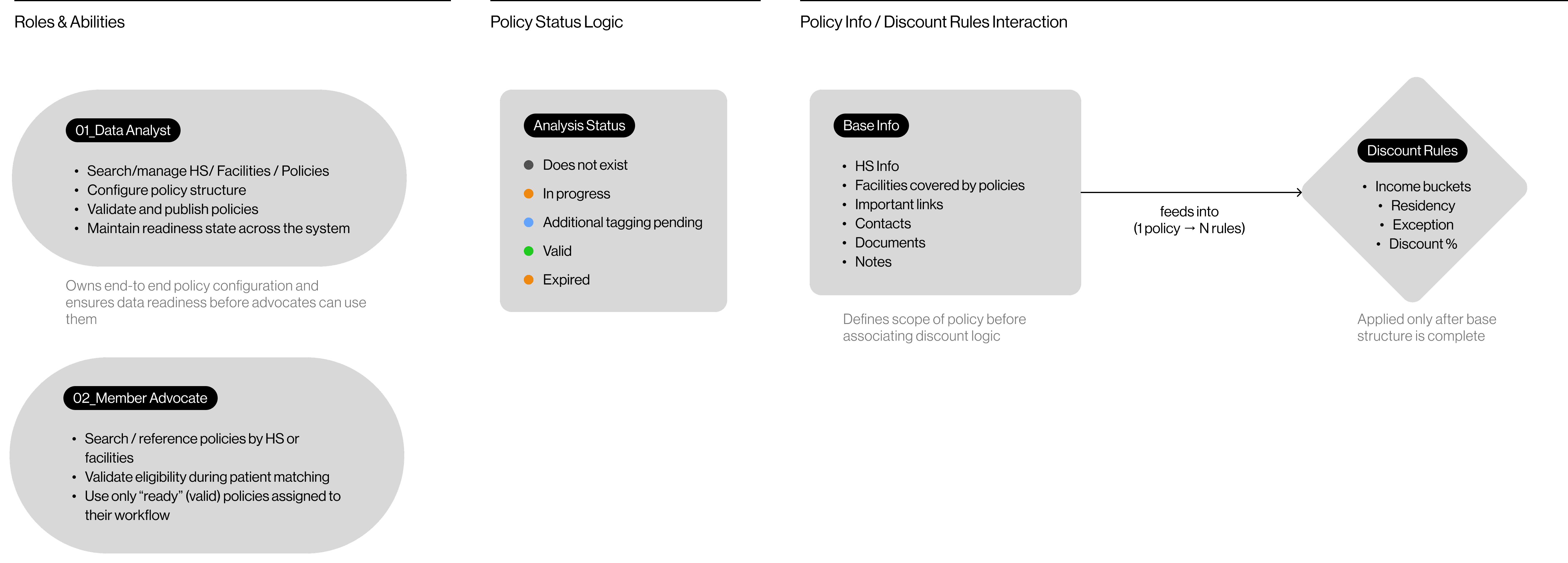 Eligibility workflows rely on inconsistent, multi-layered policy data that covers health systems, facilities, qualifiers, discount rules, documents, and status logic. Clarifying these requirements helped define what the system must reliably support before proposing solutions.