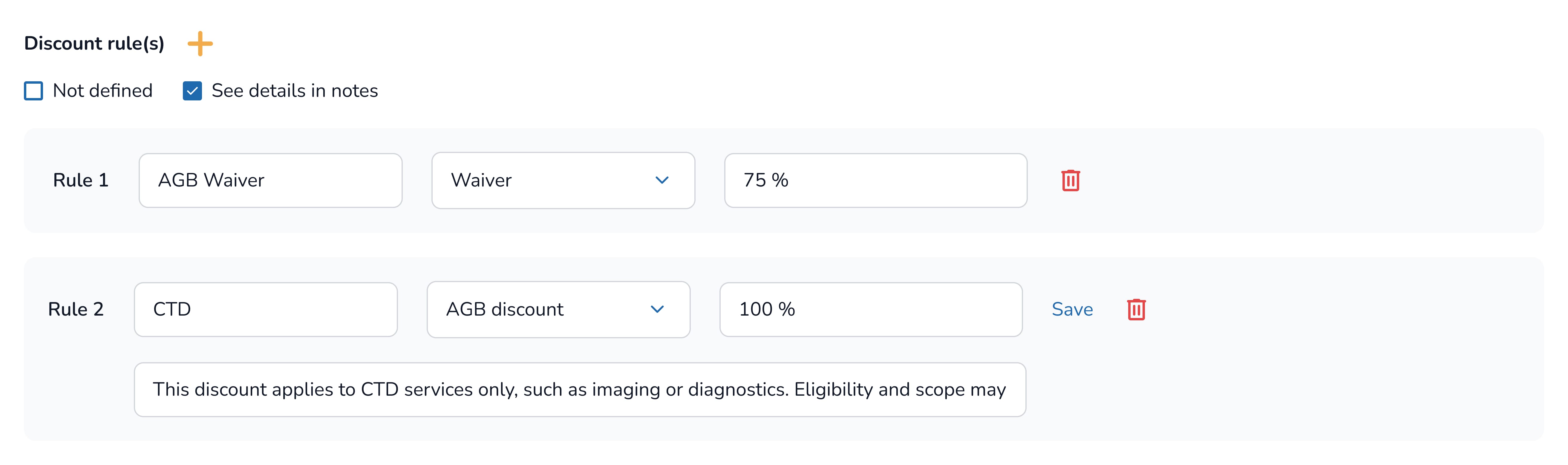 Use case: Programs commonly offer layered discounts across services. (e.g., 75% waiver + 100% discount for specific procedures). Analysts needed a simple way to define these rules without overlaps or errors.
