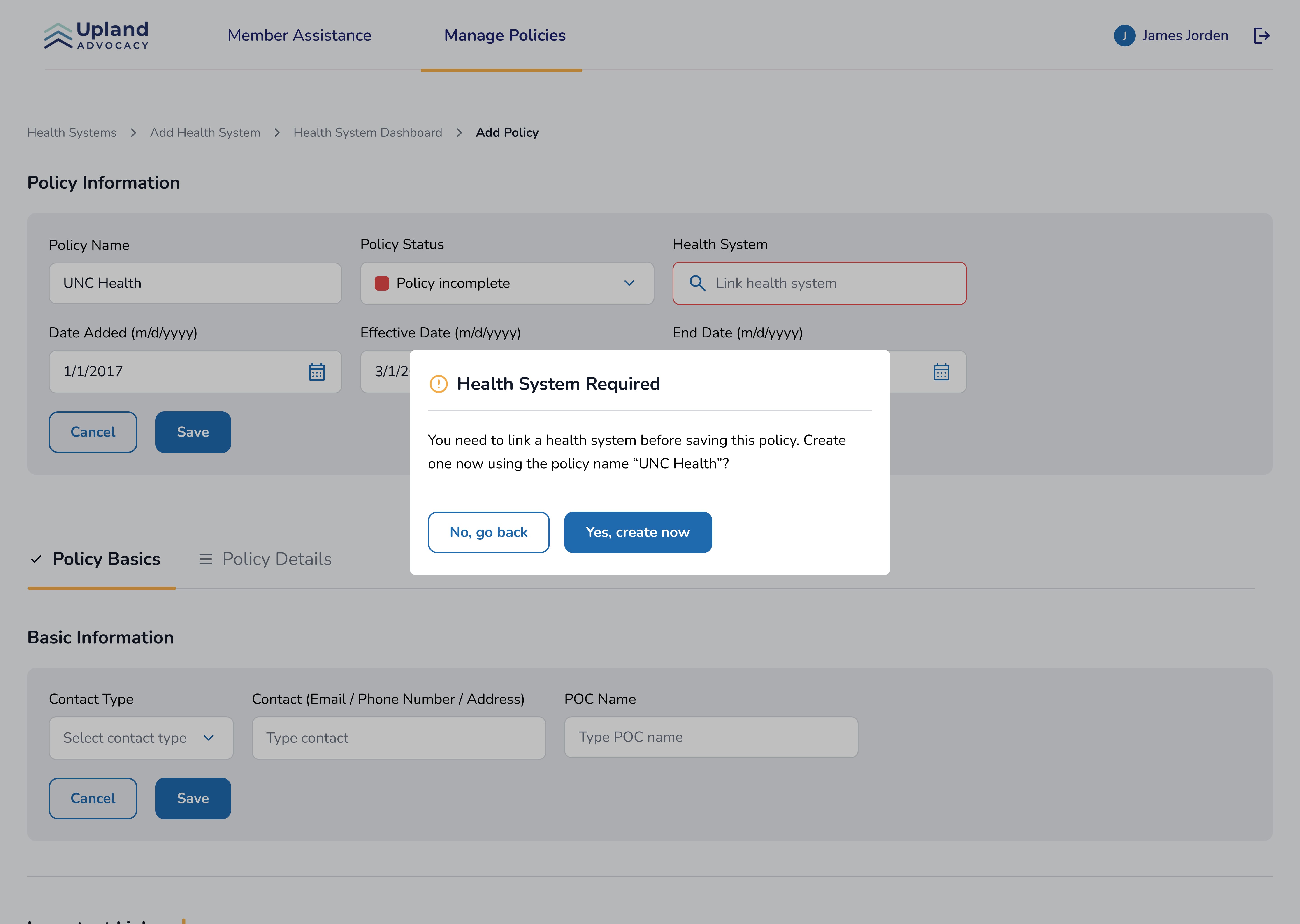 I also added a save-time system linkage check so analysts don't accidentally create policies without the required health system, a small guardrail that prevents downstream failures before they happen