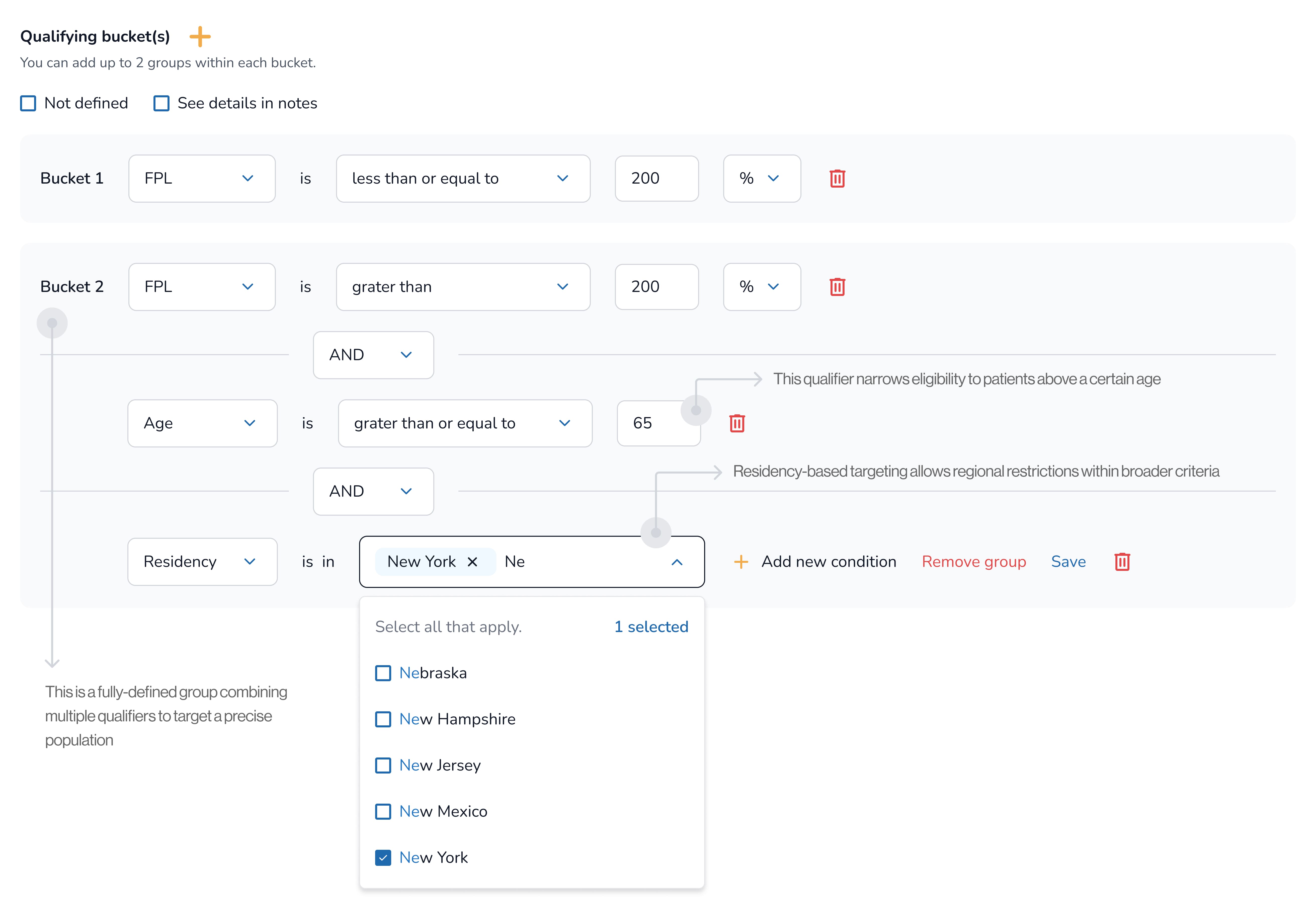 Use case: Fully composed qualifiers that require multiple factors simultaneously (e.g., Income > 200% AND Age ≥ 65 AND Residency = NY within the same group).