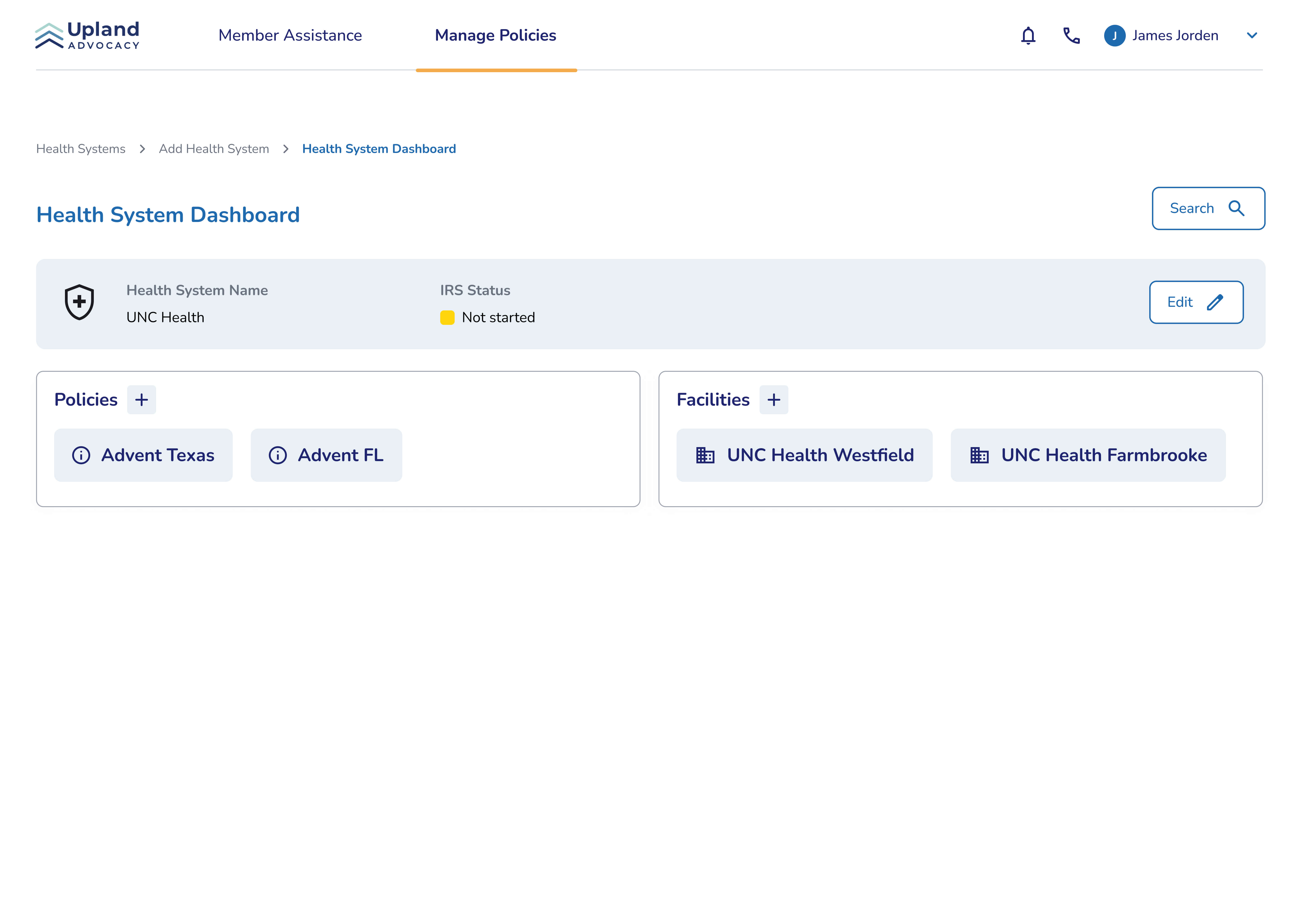 To fix this, I unified key info for each health system, showing relationships between systems while enabling quick search and in-context add actions. So, advocates can navigate complicated policies in one place.