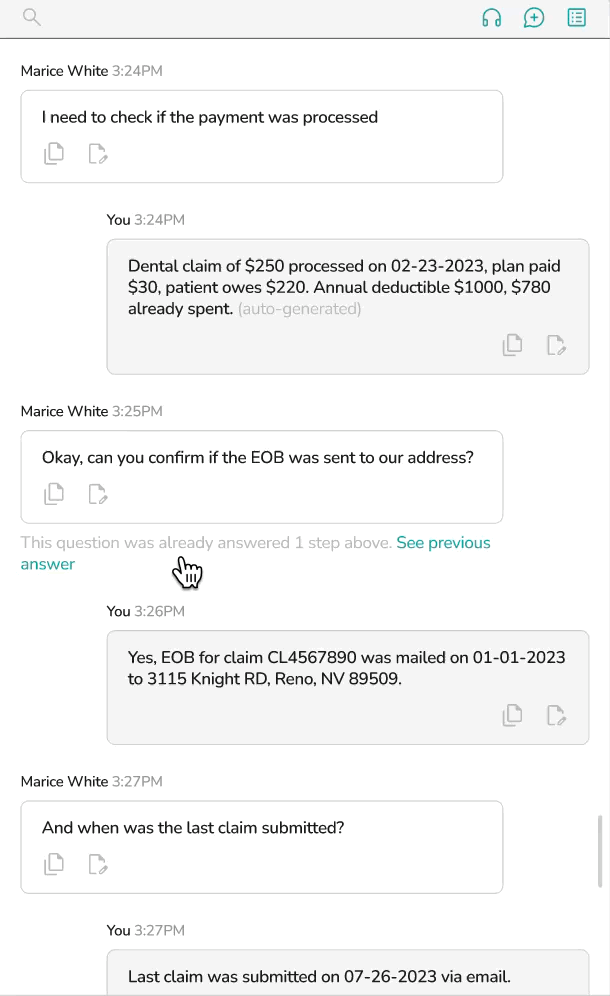When repeat questions came up, agents were shown prior answers so they could confidently answer without retracing past steps, reducing backtracking and improving consistency during calls.