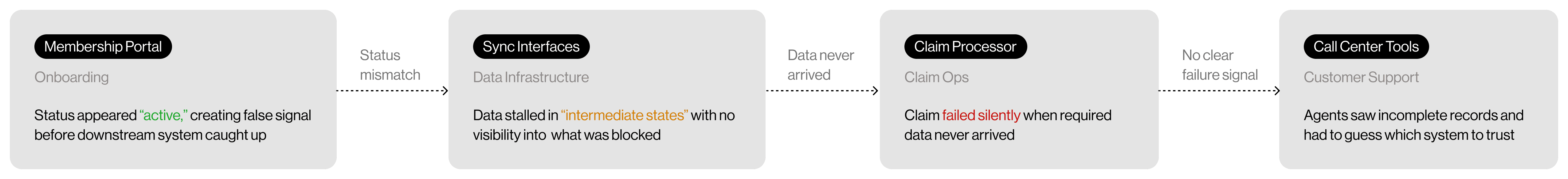 Failures rarely originate in a single spot. They spread because systems were updated at different times and followed different rules. I mapped the operational chain from start to finish, not to show off complexity, but to identify where teams lost visibility and why small mismatches became significant risks.